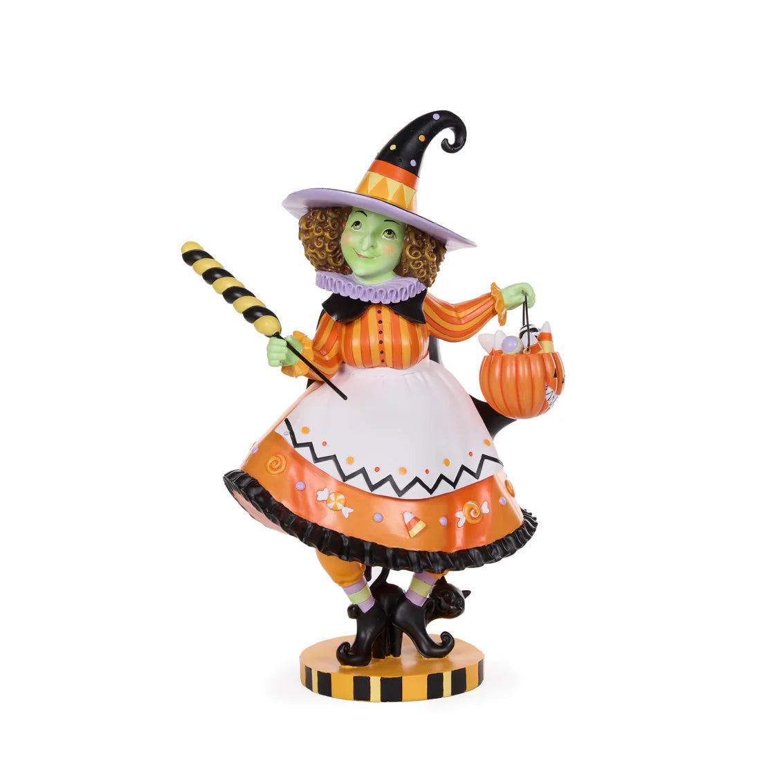 Add whimsical charm to your Halloween décor with this Witch Figurine! Featuring a stylish witch in an orange dress, striped stockings, and a pointed hat, holding a pumpkin bucket and candy stick, this piece is perfect for tabletops, mantels, or entryways. Made from durable resin for festive longevity.