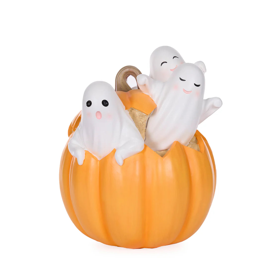 Celebrate Halloween with this Ghosts in Pumpkin Figurine! Featuring three adorable ghosts popping out of a bright orange pumpkin, this decoration adds a fun and festive touch to any tabletop or mantel. Made from durable resin for long-lasting charm.