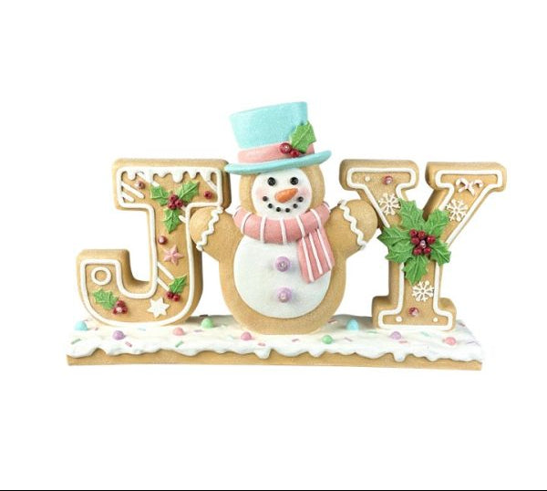 Add a sprinkle of sweetness to your holiday décor with this charming Joy snowman sign, beautifully crafted in soft gingerbread-inspired pastel tones and finished with a delicate sugar-dusted effect. Made from durable poly-resin, it’s a delightful piece that brings warmth and whimsy to any festive setting.